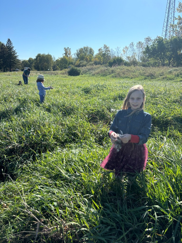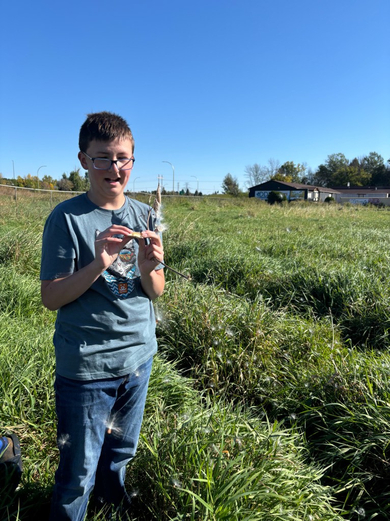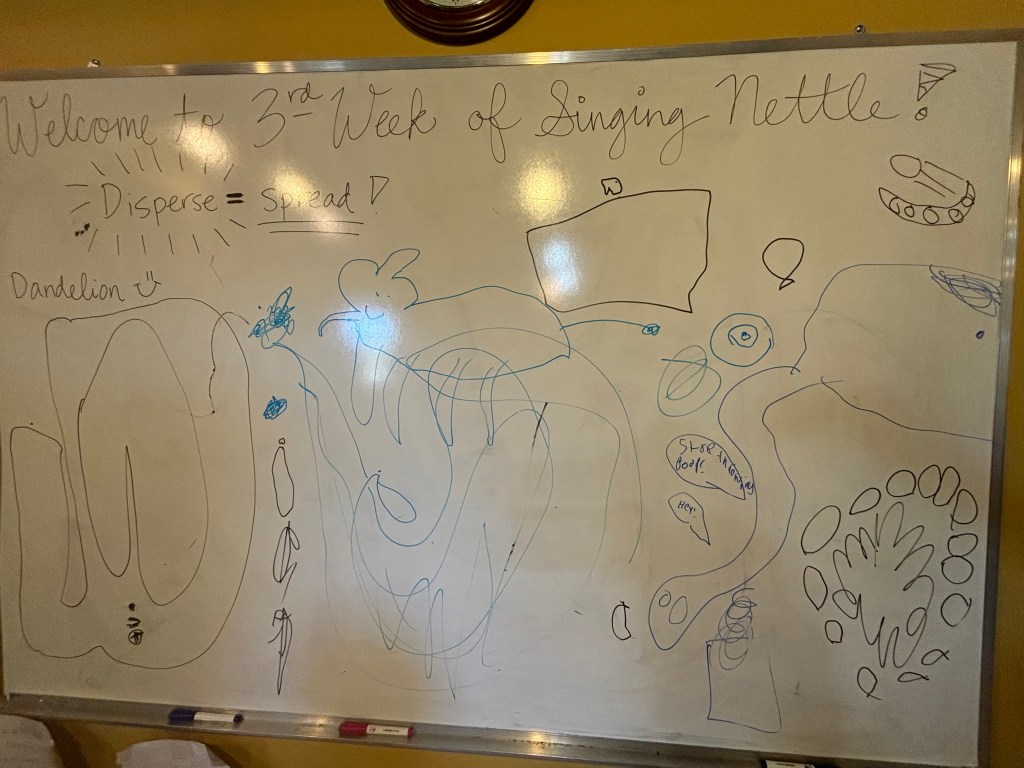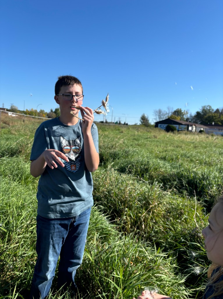 After learning about seed dispersal, we went on a walk to see real-life examples of seed dispersal. We saw mainly gravity, wind, and animal examples. We learned that milkweed might be an example of wind and explosive! Some stewards participated in mullein sword fighting with the mullein stalks!