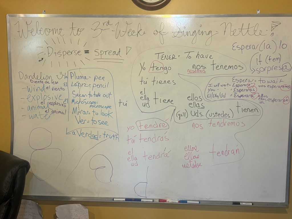 We had another wonderful Wednesday here at Singing Nettle Forest Stewards! We learned about conjugating tener, which is “to have” in Spanish. We also made flash cards to practice common Spanish phrases, like “how are you?” (como estas?), “what is your name?” (como se llama?), etc. 🙂
