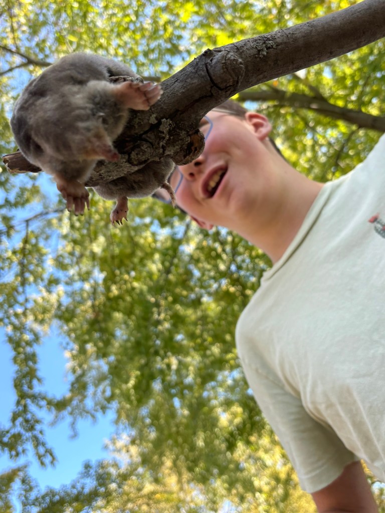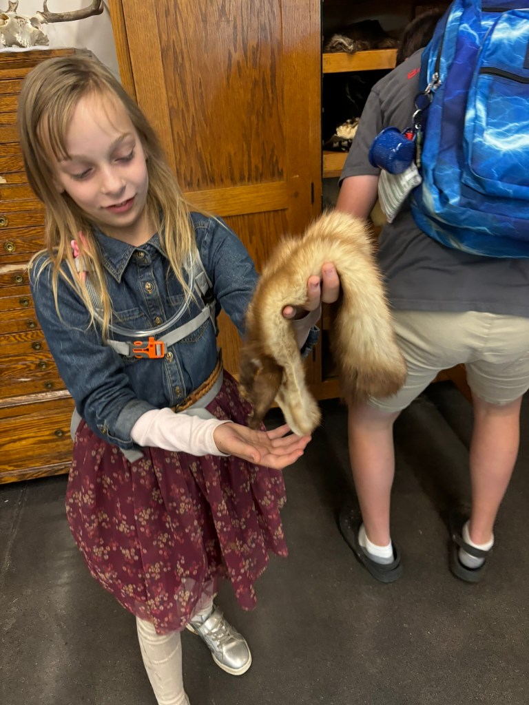 Below is a photo of our steward holding a fur pelt of a possum! We really like fur pelts! 🙂 Fun fact: our school has a lot of fur pelts and skulls to study and observe more carefully!