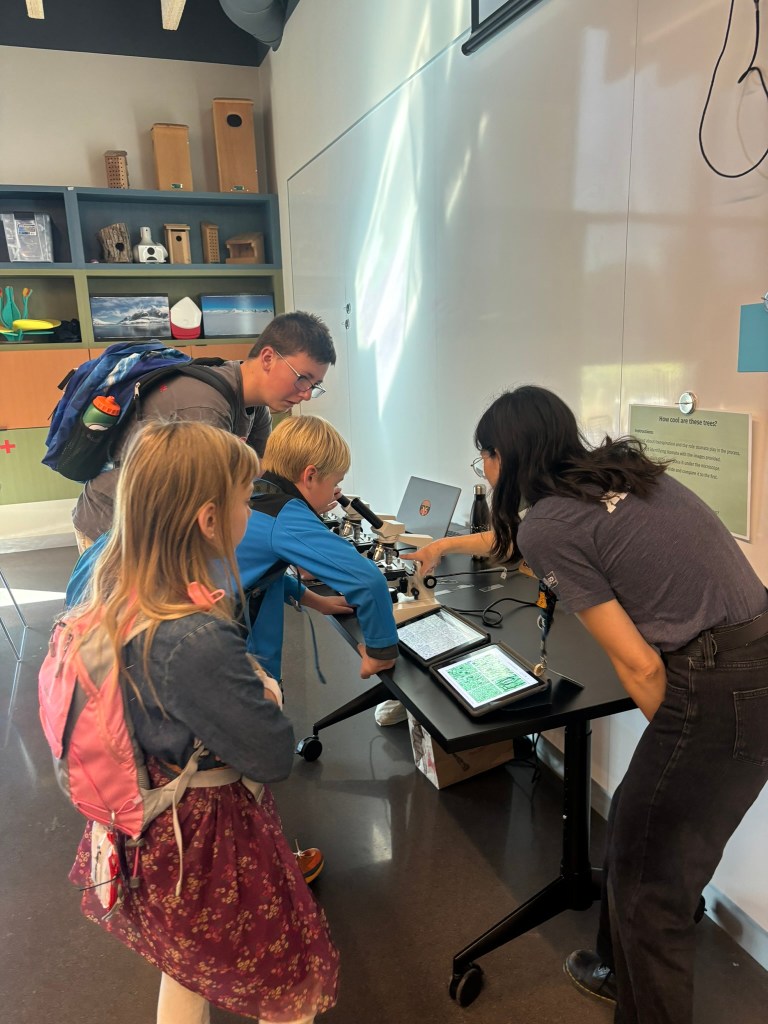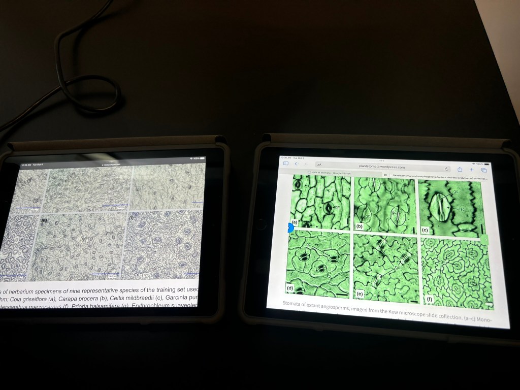 Stewards were using a microscope to observe stomata from angiosperms and slides from different tree species!