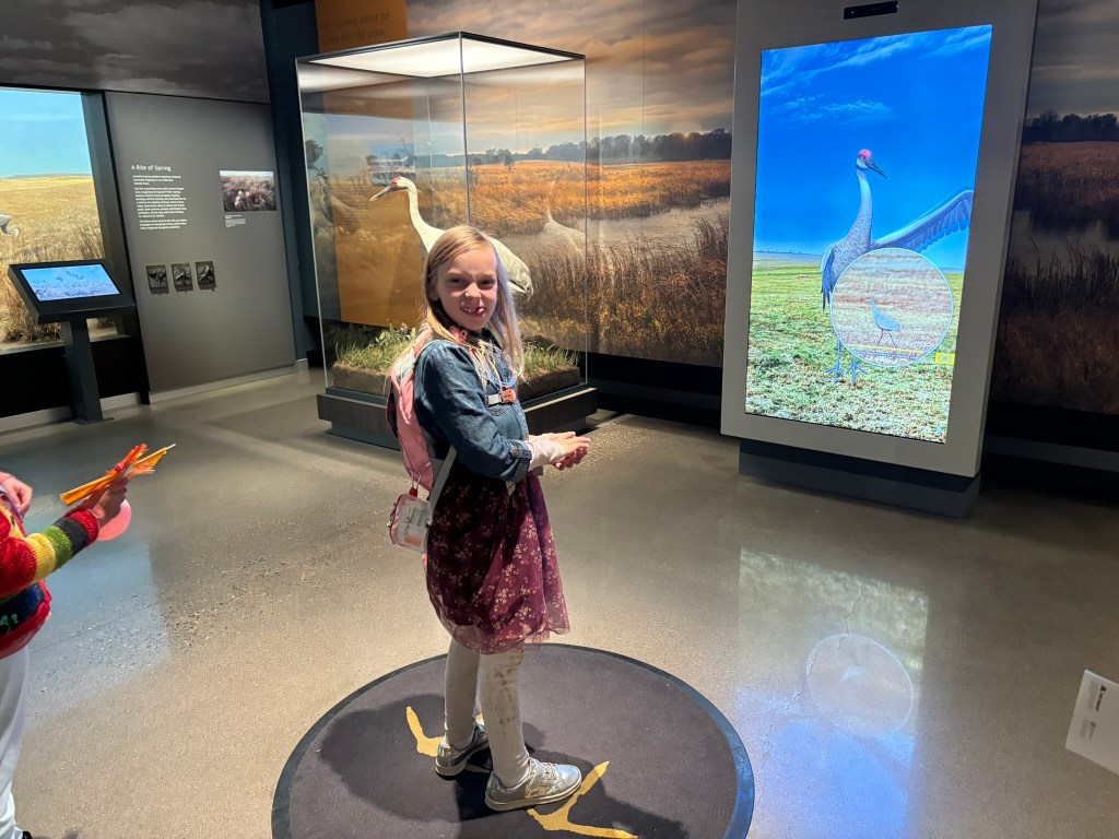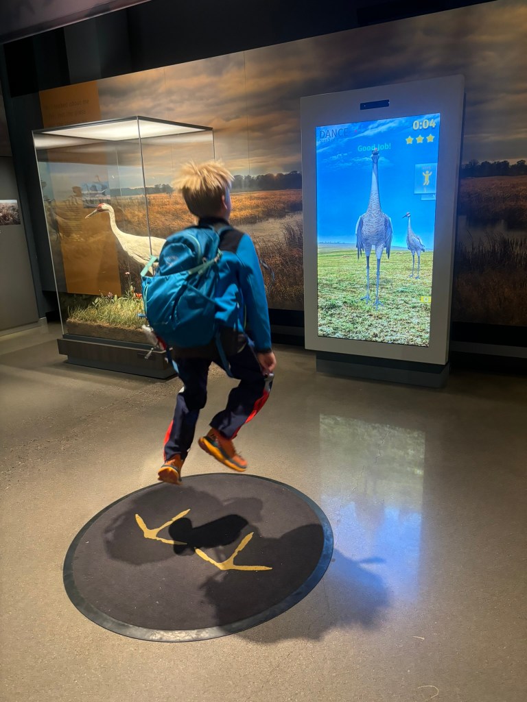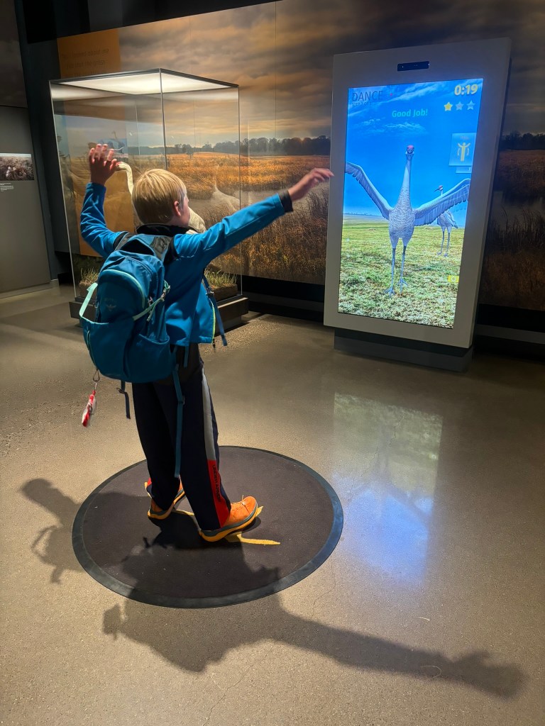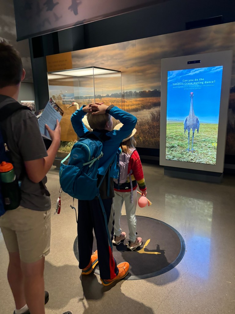 There is a sandhill crane communication and mating dance simulation at the Bell Museum, in which you can put your hands up in the air and jump like a sandhill crane! 🙂 Here are some of our stewards attempting to make sandhill crane faces, bowing, and jumping in the air! 🙂