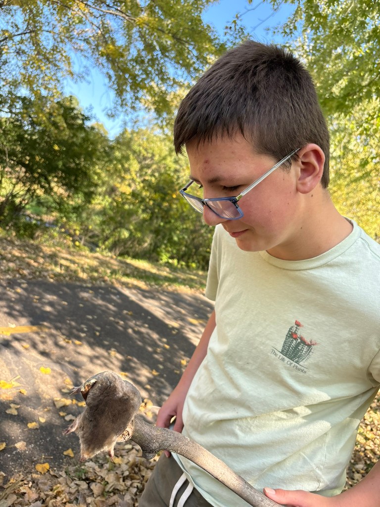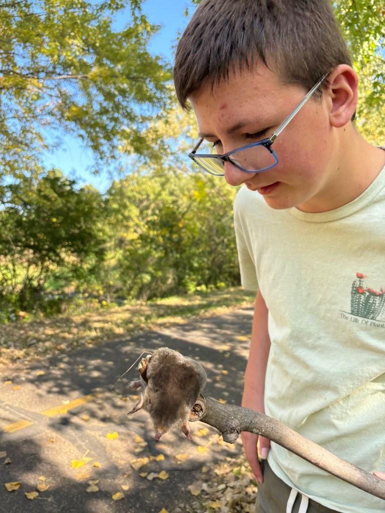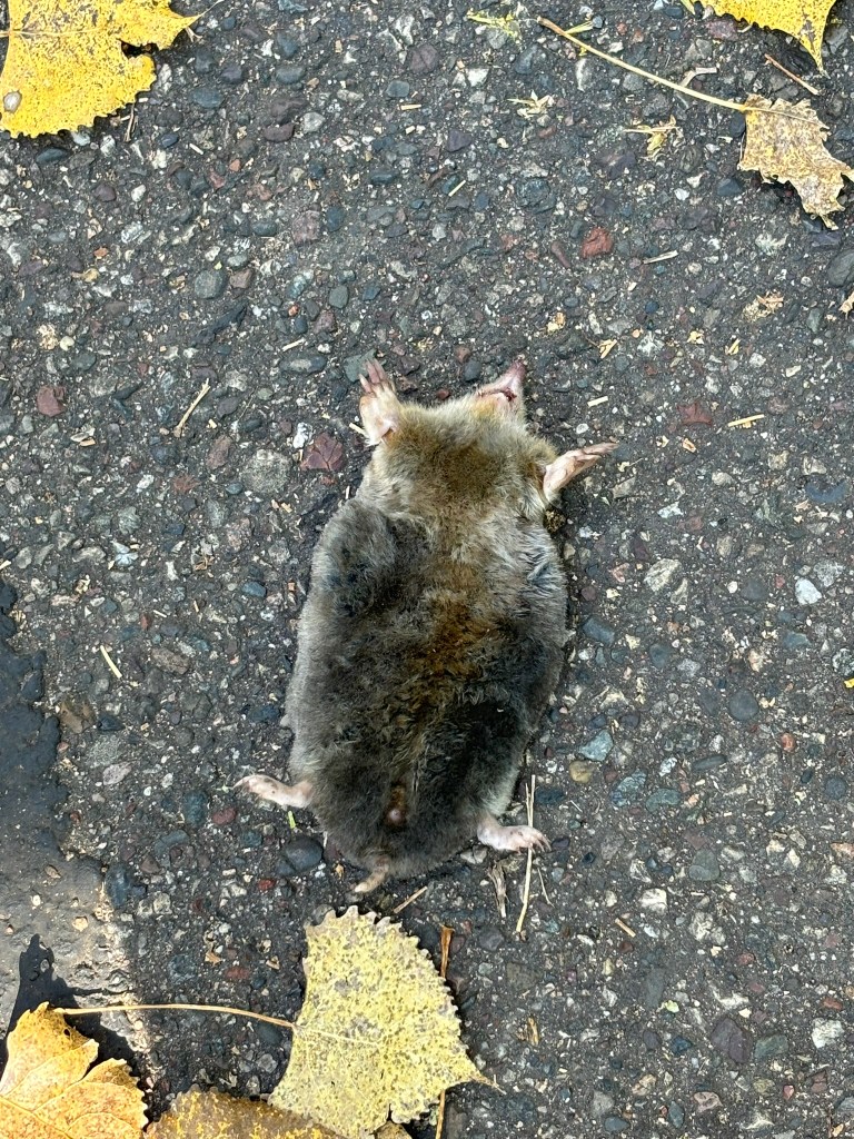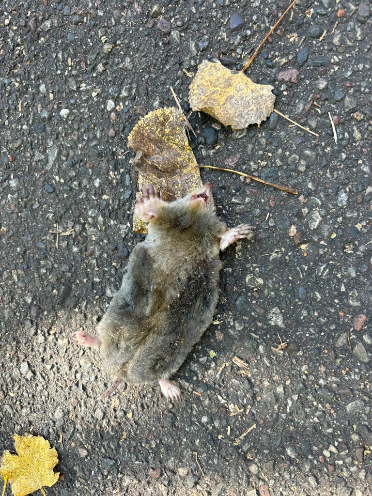 While setting out on the trail, we found a most interesting discovery! We found a dead mole on the bike road! It looked like he was squished by a bicyclist. 😦