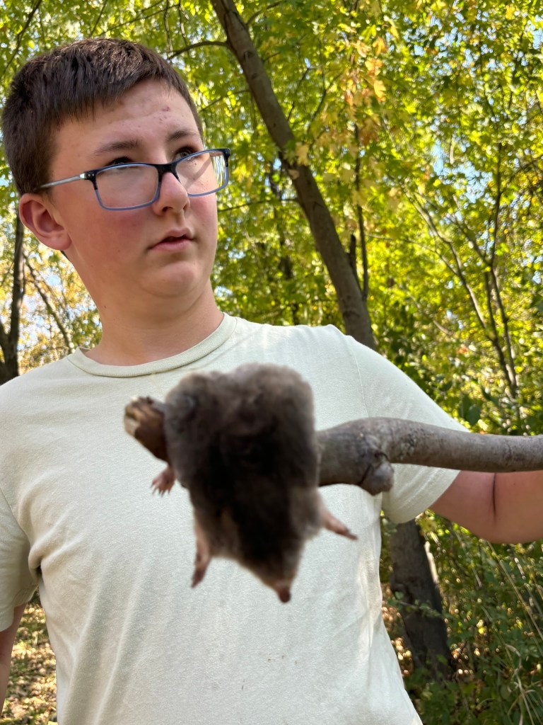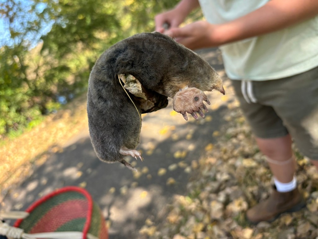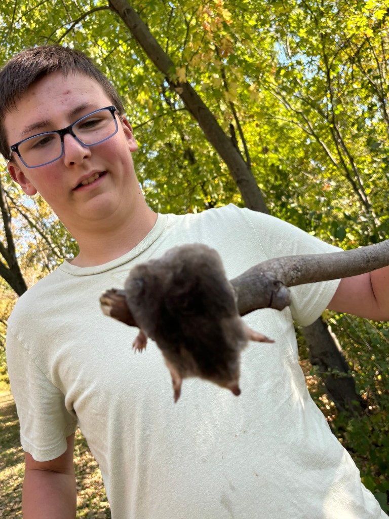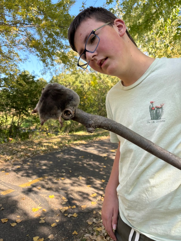 While setting out on the trail, we found a most interesting discovery! We found a dead mole on the bike road! It looked like he was squished by a bicyclist. 😦